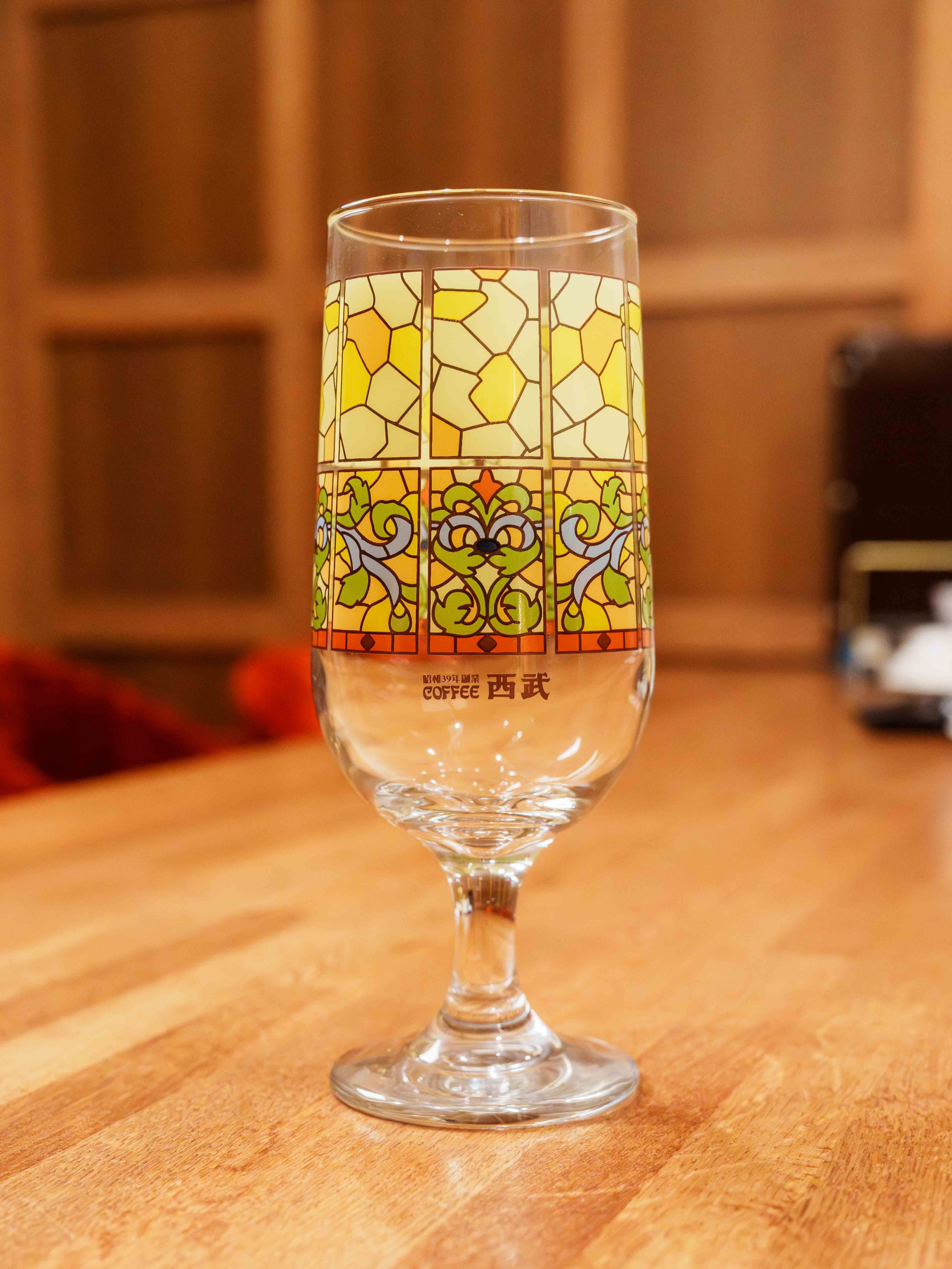An original glass featuring the iconic stained glass pattern of Coffee Seibu.